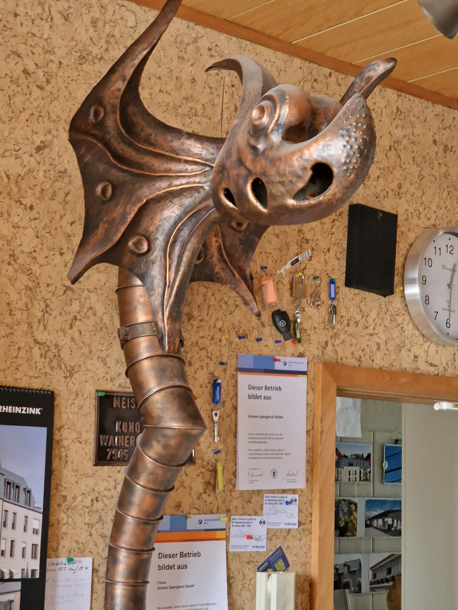 Unser kunsthandwerkliches Angebot reicht von dekorativen Rinnenkesseln bis hin zu individuellen Verzierungen. Mit viel Liebe zum Detail setzen wir stilvolle Akzente an Ihrem Gebäude und schaffen einzigartige Unikate aus Metall.